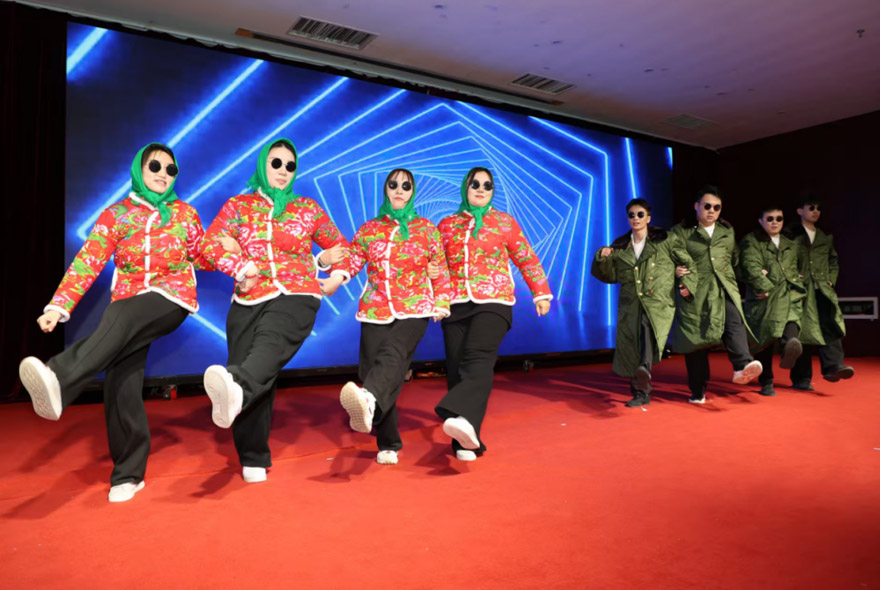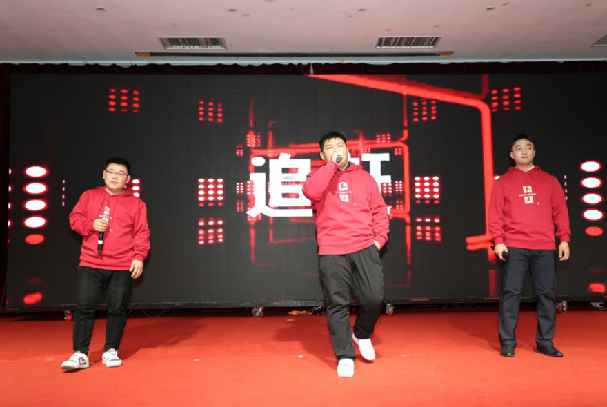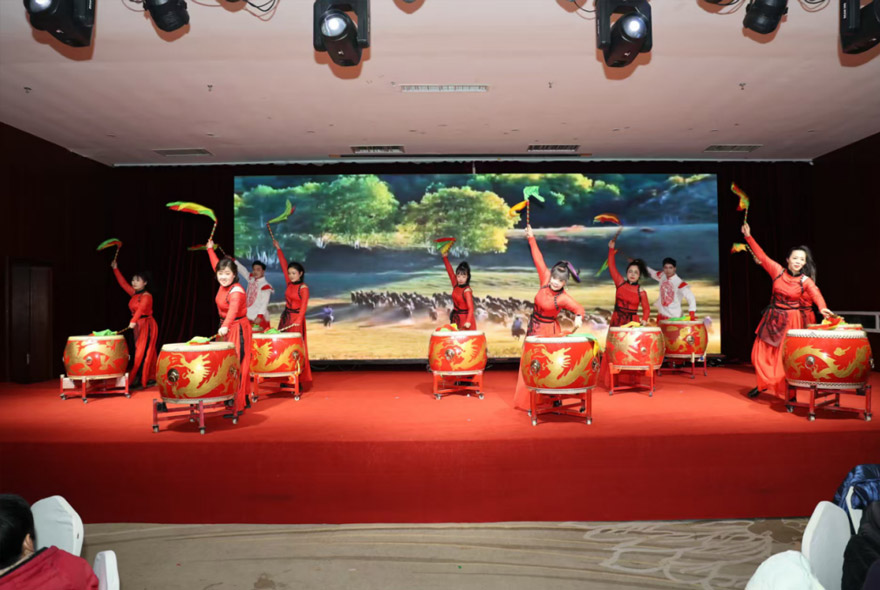 晚间晚宴温情启幕,公司经理层致祝酒词,各部门带来精彩节目演出,现场气氛热烈祥和。